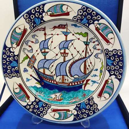 El emeğimiz ile üretilmiş Al Bayraklı Yelkenli Çini Tabak. 30 cm'dir.